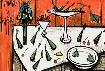 Plus proche de nous, deux compositions de Bernard Buffet des années 1991, Nature morte sur fond rouge et Barques et tentes sont entourées d’œuvres par Carzou, Brayer, Pignon ou l’italien Guttuso qui viendront clôturer cette vente de l’après-midi.
