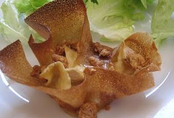 Pour le montage: 2: Découpez des cercles de feuilles de brick d'une taille convenant à des petits moule taille muffin. 3: Badigeonnez-les d'huile et placez-les dans les moules. Mettez quelque chose pour faire poids au fond ( j'ai empilé un moule sur chaque moule tapissé de feuille de brick. 4: Faites dorer au four à 200°C. Puis laissez refroidir. 5: Placez une tranche et demi de Neuchâtel au fond de chaque "coupelle" 6: Émiettez du crumble croustillant sur le fromage.