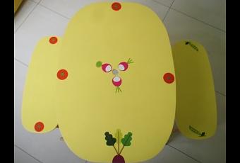 La table prévue pour l’extérieur n’avait pas bien vieilli. J’ai poncé l’ensemble des plateaux : table et bancs, j’ai appliqué deux couches de peinture (celle des murs de la chambre, récup de la peinture, couleur parfaitement identique à celle des murs). Une fois la peinture sèche j’ai collé dessus des stickers (les mêmes que la poubelle). Par dessus tout ça j’ai passé une couche de résine que l’on trouve dans tous les magasins de bricolages. La résine ne tient pas bien sur les stickers mais elle les attache bien au support.