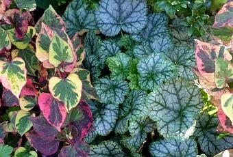 (Heuchera Green spice et houttuynia chameleon)ses lumières douces