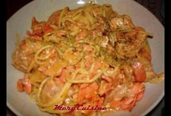 Temps de préparation : 10 mnTemps de cuisson : 15 mnIngrédients pour 4 personnes :250 gr de linguine fraîche200 gr de saumon frais 75 gr de saumon fumé25 gr de beurre25 cl de crème fraîche2 c. à s. de pesto1 c. à c. de moutarde de DijonHuile d’oliveSel et poivrePréparation :