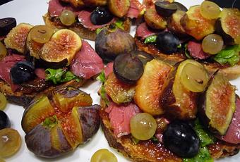 Garnir les tartines avec les tranches de magret et de figue et les grains de raisin.