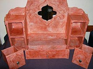 Coiffeuse en carton d'inspiration orientale, 3 tiroirs. 70 cm de large, 65 cm de haut. Finition peinture à l'oeuf et pigment oxyde de fer rouge. Entièrement vitrifié.