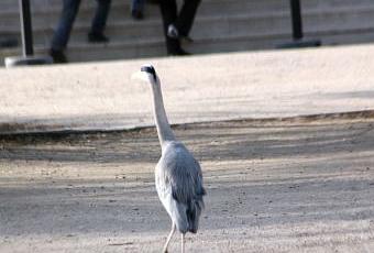 Je quittais le pied du pin laricio, le héron était maintenant à peine visible et j'avais prévu bien d'autres observations. Pendant que je m'éloignais, le bel oiseau a volé au-dessus de ma tête pour atterrir 10m devant moi dans l'allée centrale. Un peu plus loin il y avait des jeunes gens bruyants qu'on voit courir sur la photo mais rien ne fait peur à cet habitué du jardin.
