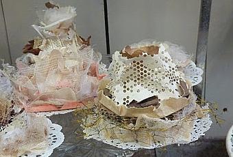 Catherine Durr et Florence Bouvier. Nous voici chez Catherine et ses créations toujours pleine de talent,un bel étalage de gâteaux.