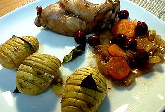 Cuire environ 1 heure. Les pommes de terre doivent être dorées et "craquelées". Servir nappé de sauce aux cerises avec le lapin. Option encore plus gourmande : farcir les pommes de terre avec du fromage type chèvre ou gruyère et des tranches de lard.