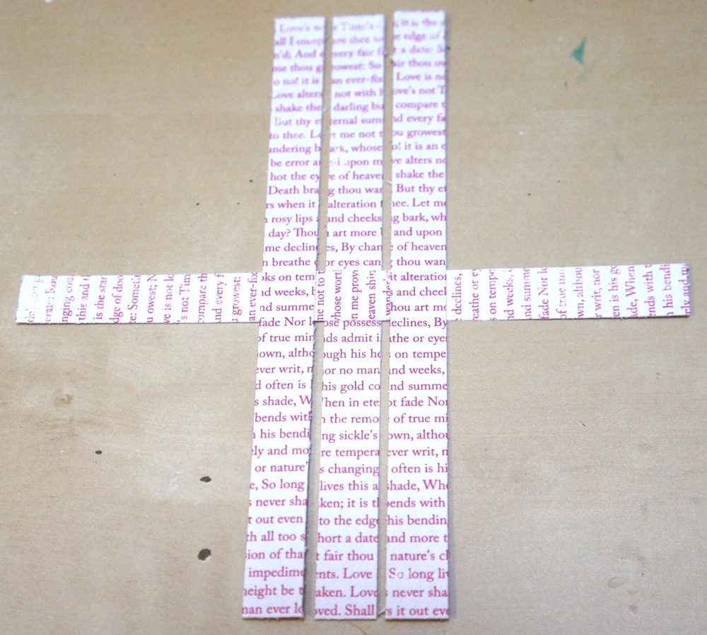 4. Collez ensuite 2 bandes verticales de part et d'autre de la 1ère bande verticale, comme sur la photo. Alors que la 1ère bande verticale est en dessous de la bande horizontale, les 2 autres bandes sont collées au dessus.