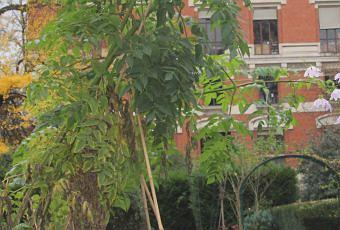 Ce dahlia est dans un petit jardin clôturé situé à l'écart. Lors de mes visites précédentes il était fermé. Aujourd'hui il était ouvert, sans doute pour qu'on puisse mieux admirer ses deux dahlias. En effet il y en a un deuxième au fond du jardin. Avant sa floraison je ne pouvais le remarquer depuis l'extérieur. Il est de la même variété mais sans doute plus jeune. Il n'a pas été tuteuré et ses longues branches se courbent gracieusement.