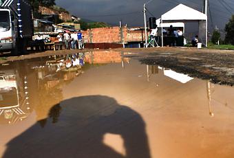 Ici, c’est le barrio El divino niño. Une heure de route jusqu’aux limites de Bogota pour l’atteindre. Un charmant bidonville à flan de montagne. Modèle ultra équipé. Des routes, sommairement goudronnées, permettent d’y circuler. Mais, avec la pisse qui coule à longueur de journée, ladite montagne dégueule terre et caillasses qui viennent s’accumuler sur la route. À la sortie du dernier virage, avant d’arriver sur site, un peu avant 7h30, une traînée de vomis de montagne fait hésiter le chauffeur de la petite camionnette louée pour transporter l’équipe. Il avancera délicatement, en faisant beugler le moteur, pour passer au-delà.