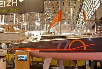 avec sa ligne de traine garnie de scintillantes (de celles qui flottent dans la flotte) au tableau de ce petit voilier course-croisière à l'allure de "grand" du chantier Marée Haute, très visité lors du salon nautique 2011.