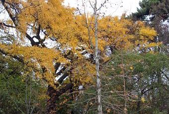 Mais voici un autre arbre. C'est une marcotte issue d'un arbre du Jardin Botanique de Montpellier qui y avait été planté en 1788. Cette marcotte fut plantée ai Jardin des Plantes de Paris en 1795. On lui greffa une branche femelle en 1832. Sur cette photo du 4 décembre il est derrière le dahlia, à gauche du bâtiment. Le haut de l'arbre est complètement dénudé, c'est la partie mâle. La partie femelle en bas garde son feuillage beaucoup plus longtemps.