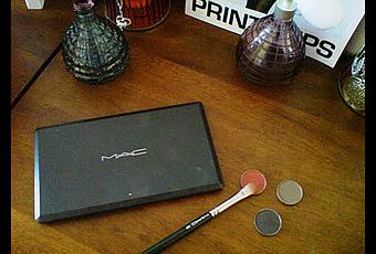 Je me suis constituée quatre palettes au fil de mes aventures compulsives en tant que "MAC-addicte". Trois de fards et une de blush. J'ai tiré profit d'une de mes boîtes GlossyBox que j'ai adaptée en rangement pour y mettre mes petits trésors.