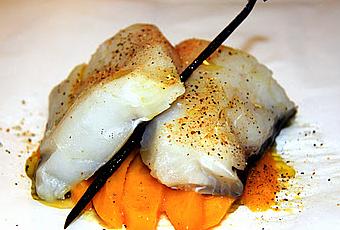 Toujours dans notre semaine Light il fallait bien une recette de poisson, et j'ai essayer de rendre goûteux ce poisson blanc... Parce qu'en vrai, il faut se l'avouer ça n'a pas vraiment de goût....Une première pour moi qui ne cuisine que le saumon, mais c'est sûr que je referais ce plat plus souvent!!Vous pouvez l'accompagner d'un bon riz blanc ou d'un Wok de légumes, à vous de voir!Par contre j'ai une petite confidence à vous faire, ce plat est Made in Surgelé... Sorry.... Je suis allée chez Picard et j'ai acheté 2 dos de Cabillaud et des Mangues coupées en morceaux.Pour les plus courageux le frais c'est mieux mais pour les pressés le surgelé c'est drôlement pratique!!! A vous de jouer!!!Enjoy!INGRÉDIENTS: (Pour 2 personnes.... et oui ce soir on était en tête à tête!!)-2 dos de CABILLAUD-2 moitiés de MANGUE fraîches ou surgelées-1 gousse de VANILLE-1 pincée de GINGEMBRE en poudre ou 5cm de GINGEMBRE frais et pelé-SEL, POIVRE-1 cuillère à café d'HUILE d'OLIVERÉALISATION:-Préchauffer le four à 180°C.-Peler et couper en fines lamelles les moitiés de MANGUE.-Couper en 2 la GOUSSE de VANILLE.-Découper 2 feuilles de papier sulfurisé.-Déposer au centre de la feuille la moitié de MANGUE coupée en lamelles et mettre par dessus le dos de cabillaud coupé en 2 morceaux.( Pour les faire tenir l'un sur l'autre vous pouvez les piquer d'un cure dent )-Insérer entre les 2 morceaux de cabillaud la demi gousse de Vanille.-Mettre une pincée de GINGEMBRE, SEL, POIVRE.-Arroser d'une demi cuillère d'HUILE d'OLIVE.-Mettre une deuxième feuille de papier sulfurisé par dessus et former une papillote.-Enfourner pendant 20min.