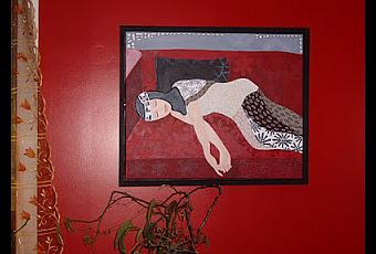 Voici "Le sofa rouge" désormais accroché sur le mur d'une demeure de l'ouest parisien. Je trouve l'endroit bien approprié, comme un écrin idéal pour cette toile. Dessous, un bégonia avec ses branches graciles. J'en profite pour recommander aux amoureux de ces plantes et de la botanique la visite du conservatoire du bégonia de Rochefort, une plongée fascinante dans la jungle amazonienne.