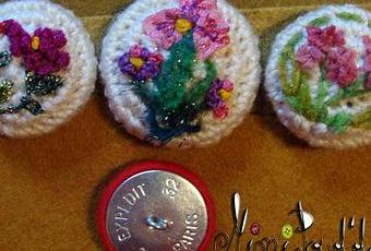 et c'est ici que je m'arrête momentanément sans couper le fil hein attention !! afin de pouvoir broder une fleur sur le bouton comme ce n'est pas évident sur fond crocheté j'utilise des fils assez épais, du ruban et des points simples car les points ne se placent pas forcément correctement à cause du fond pas de modèle on se laisse aller à l'ispiration et on voit ce que ça donne ^^. Une fois la fleur ou le motif brodé on reprend le crochet !