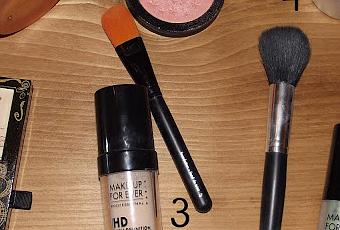 L'étape suivante, c'est le fond de teint (3) (parfois je passe par la case base lissante, mais j'avoue que je n'en ai pas en ce moment, donc je fais sans, j'utilise la Sephora sinon). Je possède un fdt MUFE, celui de la gamme HD teinte #117 (la plus claire), et je dois dire que j'en suis entièrement satisfaite ! De plus, bien que coûtant 30€ et quelques, le rapport qualité/prix est excellent je trouve (je l'utilise 5jr/7 depuis fin août et il m'en reste les 3/4 !!!). Il camoufle bien les imperfections/rougeurs sans effet plâtre/masque... Bon bien sur en cas de gros spot comme tous les autres... Il ne peut pas faire disparaître un relief ^^ Mais un de ses gros +, c'est qu'il existe vraiment une multitude de teintes, ce qui permet à chacune de trouver celui correspondant à sa carnation. Je l'applique donc soit au pinceau (pinceau fdt Sephora #47), mais le plus souvent c'est à la main, une pression suffit pour tout le visage.