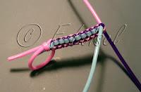 Maille suivante on inverse encore, on repart dans le sens anti horaire, chaque fil revient toujours à son point d'origine. Le fil violet dans la boucle rose, le fil rose dans la boucle bleu, le fil bleu dans la boucle violet.