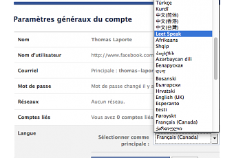 Dans vos options de compte vous pouvez choisir la langue de Facebook. Mais saviez-vous que certaines des langues sont là seulement pour faire rire ? En effet il existe des langues telles que 1337 qui vous permet de voir votre Facebook en langage leet, Upsidedown qui met tous les caractères à l’envers, ou encore Pirate pour que Facebook utilise un vocabulaire de pirate ! Il ne vous reste plus qu’à essayer et vous amuser avec les différents langages proposés !