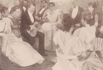 Mots clés XIXe siècle; Troisième République; arts et spectacles; arts plastiques; art officiel; salon artistique; salon de 1891; photographie d'oeuvre d'art; peinture; peintre; photographe; tableau; activité ou manifestation artistique; mondanités parisiennes; guitare; instrument de musique; instrumentiste; chanteur; homme; femme; spectacle; spectateur; scène; scène de genre; scène d'intérieur; histoire de la musique; personnage du monde des arts
