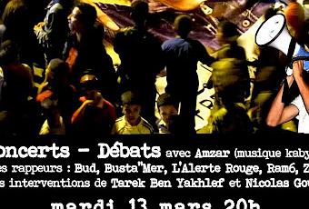 Cette soirée est organisée en soutien aux peuples en luttes dans le monde arabe, avec au programme des interventions de spécialistes (Tarek journaliste et scénariste, Nicolas Gouasde sociologue…) et une partie musicale orientale et hip hop.