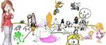 Une chouette Lulu et la grenouille de Ced. Sélina, qui a tout prévu avec sa valise, Cathy qui lutte contre le nutella sur le blog d'une grosse, Pluche et Zip qui entourent un mystérieux personnage, Zip le moustique de MrOlivier. Mon voisin taupe est en grande conversation avec la tortue de Susie. Plus à droite encore, le jeune et jaune Doo et ses yeux globuleux, Manou qui drague le Chevalier Fred échappé du Donjon des Lémovices avec à ses pieds Lotus et Oust, de T_tus, et enfin la joyeuse bande du Globi des petits, de Demaho.