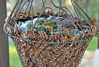 Piqué de plusieurs sortes de joubarbes (Sempervivum à feuilles vertes duveteuses et Sempervivum à feuilles rouges), cet ancien panier à salade se balance toute l'année avec comme seul arrosage, l'eau délivré par les pluies au gré de la météo. Des feuilles de fougère cachent le géotextile nécessaire pour retenir le substrat (un mélange de terre végétale et de sable pour obtenir un mélange humifère et drainant).
