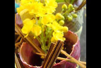 J'ai utiliser des coquilles d'oeufs. Je les ai décorées de petits morceaux de papier journal collés avec un mélange de colle blanche et de gouache de différentes couleurs. J'ai déposé les coquilles une fois sèches dans une boîte d'oeuf retaillée. Je les ai remplie avec de l'eau colorée (betterave, choux rouge et oignons rouges) qui m'a servie à colorer les oeufs pour la chasse de Pâques. Quelques fleurs et feuilles cueillies autour de chez moi et des petites tiges de bois ont rempli les coquilles.
