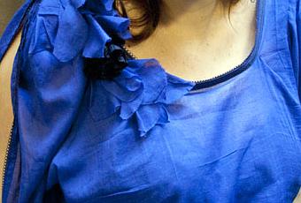 J'ai jeté mon dévolu sur un modèle du Burda d'avril 2012 (Top 115A) que je trouve juste terriblement élégant. Je l'ai réalisé en voile de coton bleu, une chute de rideaux qu'une dame s'apprêtait à jeter. J'ai d'ailleurs profité de ses ourlet déjà faits en récupérant l'ourlet du bas pour le bas du top et l'ourlet latéral qui est devenu celui des manches. D'ailleurs, parlons-en des manches... C'est à cause d'elles que j'ai voulu réaliser ce modèle et, une fois encore, j'ai compris que dalle aux explications Burda pour réaliser les plis. J'y suis donc un peu allée en freestyle et, ouf, le résultat est tel qu'espéré. Ensuite, pour rendre ce top juste encore plus chouette, j'ai ajouté une fine bordure de dentelle, remplacé la parementure d'encolure par un biais et cousu quelques fleurs sur l'épaule droite. Je suis tellement ravie du résultat qu'il est possible que je fasse bientôt la robe du même patron. (et hop, encore un truc sur ma to-do list...)