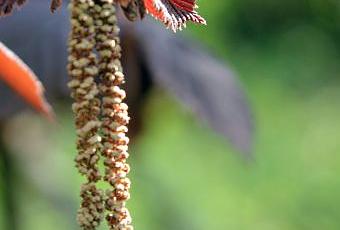 La solution, c'est Corylus avellana purpurea. Je vous avais montré ses chatons photographiés le 1er mars à tous les stades : des chatons déjà vidés de leur pollen, des chatons très jeunes encore très fermés. Le 20 avril il y a encore des chatons fertiles qui contiennent encore du pollen :
