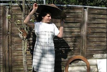 Cette robe est le modèle D3 du livre "Feminine wardrobe". Elle est faite dans du lin-coton (qui se froisse nettement moins qu'un lin classique), sans modification du patron. Je lui ai juste ajouté 2 longs rubans, faits dans le même tissu que le haut de la robe, dans les coutures des côtés pour pouvoir la ceintrer dans le dos en faisant un joli noeud qui rappelle le noeud sur le devant.