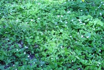 L’espèce la plus fréquente dans la nature est Fragaria vesca, la fraise des bois. A Veneux et à Romilly elle est spontanée. A Romilly je favorise son installation comme couvre-sol en désherbant à la main puis quand le tapis est bien installé je me contente d’un fauchage au-dessus en laissant sur place les produits de coupe comme engrais. La production est importante au printemps mais continue plus faiblement jusqu’en septembre.