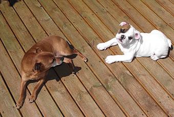 Dimanche dernier (le 13 mai 2012) cela à fait 2 semaines qu'Hulky (le petit tout blanc) à rejoint notre famille. Sur la photo on voit avec grand plaisir qu'il a bien intégré son nouveau foyer, sur cette photo prise dimanche il bronze sur la terrasse avec son colocataire Voyou. Il est allé voir le vétérinaire samedi pour son rappel de vaccin, en 2 semaines il a bien grandi car il pèse à présent 5,7 kg et ce n'est pas fini car il est en pleine croissance le petit, encore un rappel de prévu dans un mois puis ensuite il sera tranquille pour 1 an.Voyou lui de son côté n'aime pas trop quand Hulky vient le chercher pour jouer, il a tendance à rouspéter car il préfère dormir tranquille dans un coin que de faire joujou, j'espère que cela changera et qu'ils se payeront de bonnes parties de jeux quand Hulky sera un peu plus vieux (car il n'a que 2 mois et demi).