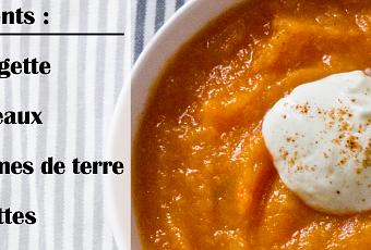 Eplucher et laver les légumes. Puis les découper grossièrement. Plonger les légumes dans une casserole d’eau bouillante et laisser cuire une bonne demie heure. Egoutter les légumes puis passer au mixeur et voilà ! Il ne reste plus qu’à déguster avec une cuillère de crème fraiche ou quelques copeaux de parmesan. Je vous laisse décider. Régalez vous. B