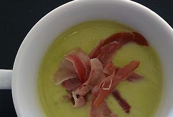 3. Taillez le jambon en fines lanières avant de les saisir à la poêle. Servez le velouté bouillant et disposez les lanières de jambon par dessus. C'est prêt !