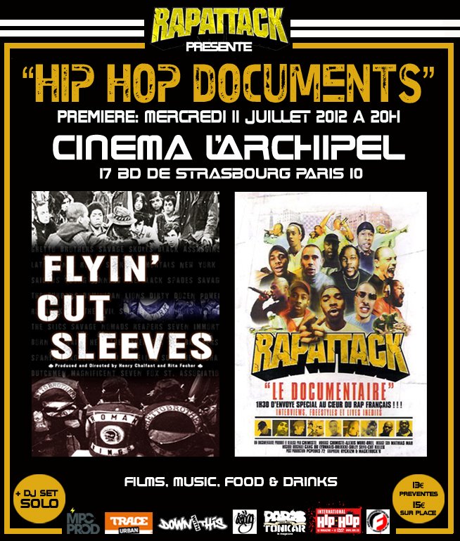 La « première » aura lieu le mercredi 11 juillet au cinéma l’Archipel 17 Boulevard de Strasbourg à Paris et présentera « Flyin’ Cut Sleeves » un documentaire produit et réalisé par Henry Chalfant et Rita Fecher sur la vie des gangs du Bronx au début des années 70 ainsi que « Rapattack » réalisé par David Le Chimiste qui raconte l’avènement du Hip Hop en France dans les années 80.