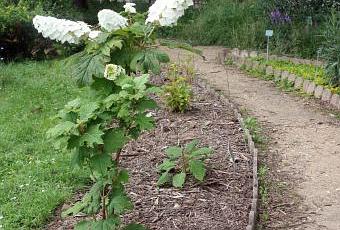 Hydrangea quercifolia est en fleurs à Paris. Les fleurs fertiles sont encore en boutons sur certaines grappes, épanouies sur d'autres. Les fleurs fertiles épanouies attirent les abeilles.