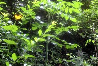 Ce n'est évidemment pas une fleur de dahlia, il fleurit en automne. Avec lui, au pied d'un forsythia qui leur servira de tuteur, j'ai planté la seule courge que j'aime, la courge spaghetti. Elle a commencé par s'appuyer sur un camellia avant de s'élancer dans le forsythia. C'est sa première fleur qui vient de s'ouvrir :