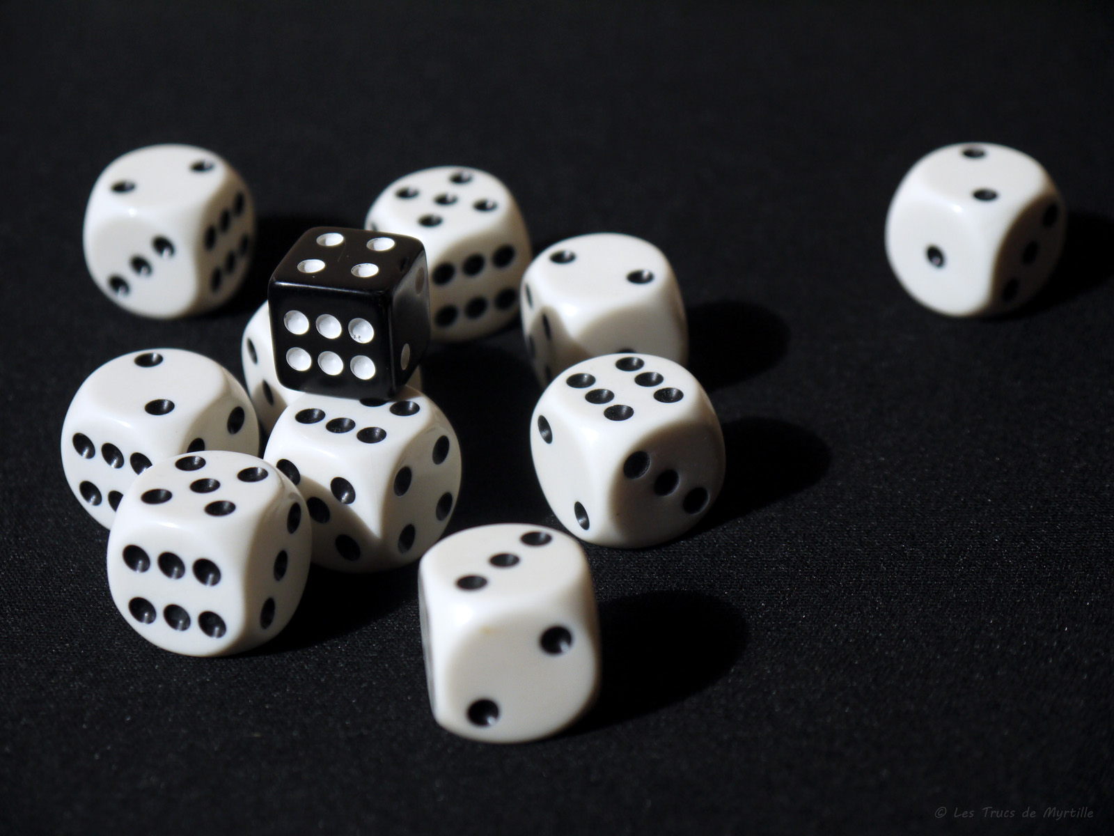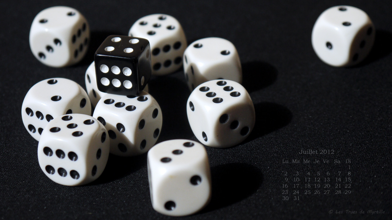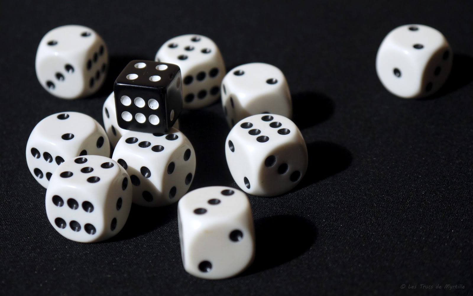 En attendant d'en rajouter d'autres très vite, parce que j'ai pris l'habitude d'avoir plus d'un fond d'écran en diaporama, voici déjà mes dés en noir et blanc. (photo couleur, mai 2012 ^-^)
