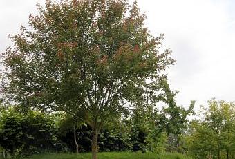 Ses feuilles sont rouges au débourrement et pourpres à l'automne. Mais, comme vous le voyez ici le 30 juin, les plus jeunes feuilles en bout de branches sont également rouges en plein été et je vous assure que ces rougeurs le font remarquer de loin.