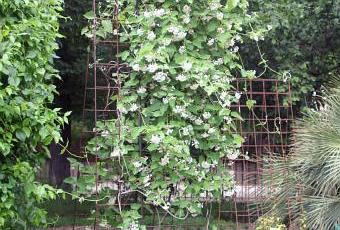 Cette très jolie liane asiatique est maintenant couramment proposée dans les catalogues de plantes. Elle ne nécessite aucun entretien. Elle peut atteindre 6 à 7m mais vous pouvez lui donner comme ici un support moins élevé, elle en retombera avec grâce.