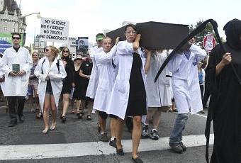 Les scientifiques en sarrau et des «femmes endeuillées vêtues de noir» ont marché au son de musiques funèbres, scandant «pas de preuve, pas de science, pas de vérité, pas de démocratie».