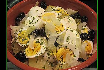 5 pommes de terre4 œufsOlives noires 2 oignonsPersil2 feuilles de laurierHuile d'olive Sel et poivrePréparation :Faire dessaler la morue ( 12 heures dans de l'eau pour des miettes de morue et 24 heures pour des morceaux ) Une fois la morue dessalée, la faire cuire dans de l'eau avec les oignons pelés entiers et le laurier, pendant environ 20 minutes.Faire cuire à part dans de l'eau, les pommes de terre entières non pelées pendant environ 20 minutes ainsi que les œufs environ 10 minutes.Dans un plat allant au four, arroser le fond du plat d'huile d'olive, éparpiller dessus les miettes de morue, 2 œufs durs coupés en tranches, des pommes de terre coupées en tranches, un oignon cuit coupé en tranches, quelques olives, du persil, saler et poivrer.Arroser d'huile d'olive et répéter l'opération une nouvelle fois.Enfourner la Morue à la Portugaise au four pendant 20 minutes à 200°.