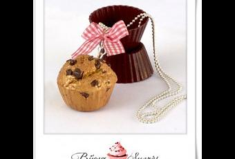Voici donc une de mes dernière création : Un sautoir Muffin au chocolat. Je l’ai voulu le plus réaliste possible, j’espère que le résultat vous plait. J’y ai ajouté un nœud vichy rose que j’ai cousu à des petits anneaux et accroché à une chaine à billes argentée de 70cm.