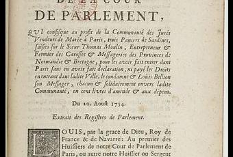 "Arrêt du Conseil d'Etat qui confisque au profit de la communauté des jurés vendeurs démarée à Paris 3 paniers de sardines, saisies sur le sieur Thomas Moulin, entrepreneur et fermier des carosses et messageries des provinces de Normandie et Bretagne pour les avoir fait entrer dans Paris, sans en avoir fait déclaration / France. Conseil d'Etat (13..-1791), 1734"