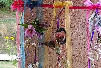 Voici donc mon interprétation tout en couleur d'un porte soliflore original fait à partir d'une branche en bois d'un arbre de mon jardin, de rubans d'organza colorés et de fil métal tourbillonnant pour attacher les soliflores qui bien sur portent les fleurs de mon jardin.