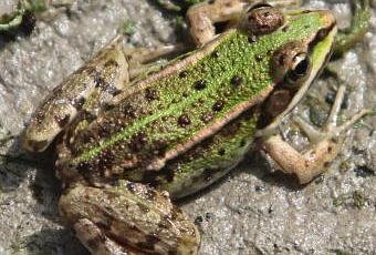 Devant le portail, près de la flaque due aux engins, cette très petite grenouille verte :