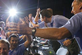 Débordants de joie, les employés ayant travaillé sur la mission, vêtus de polos bleus avec la date du 5 août brodée sur le coeur, ont fait irruption dans la salle où les responsables de la mission allaient tenir leur première conférence de presse, en brandissant des petits drapeaux américains, semant une joyeuse pagaille pendant plusieurs minutes.