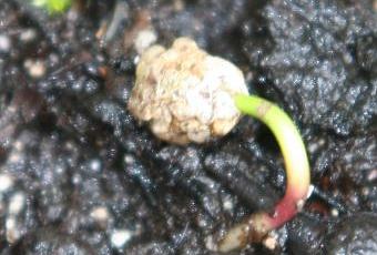Sambucus peruviana est un sureau tétraploïde, le seul, il a 72 chromosomes (36 pour nigra). J'ai obtenu des graines à partir de fruits séchés vendus comme friandises. Il y avait 5 à 9 noyaux par fruit, le plus souvent 7. Les autres sureaux ont le plus souvent 3 et au maximum 5 noyaux par fruit. C'était pour moi la preuve qu'il s'agissait bien de ce sureau tétraploïde. Je n'ai obtenu qu'une seule germination. Le 1 avril 2008 :