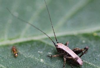 La decticelle est une toute petite sauterelle. Elle est facile à reconnaître : elle a de longues antennes de sauterelle, des fémurs postérieurs larges et puissants pour bien sauter, et elle n'a pas d'ailes. Celle que je vais vous montrer est sans doute la decticelle cendrée, Pholidoptera griseoaptera.
