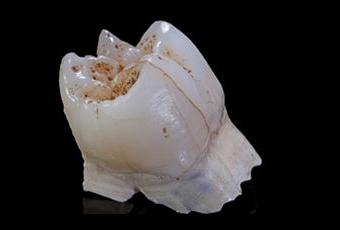 Première molaire supérieure droite d’un Homo. Les chercheurs ont utilisé un laser pour y faire de minuscules trous avant d’analyser la composition chimique de l’émail dentaire. Photo : José Braga et Didier Descouens